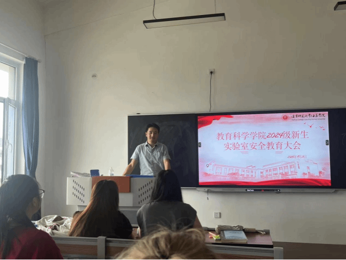 为加强学院实验室安全管理工作,预防安全事故发生,确保教学、科研工作安全有序开展,教育科学学院于9月3日下午在教学楼4-305召开了2024新生实验室教育安全大会。由辅导员杨雪松老师主讲,教师林会琪及全体2024级学前教育专业学生参加。