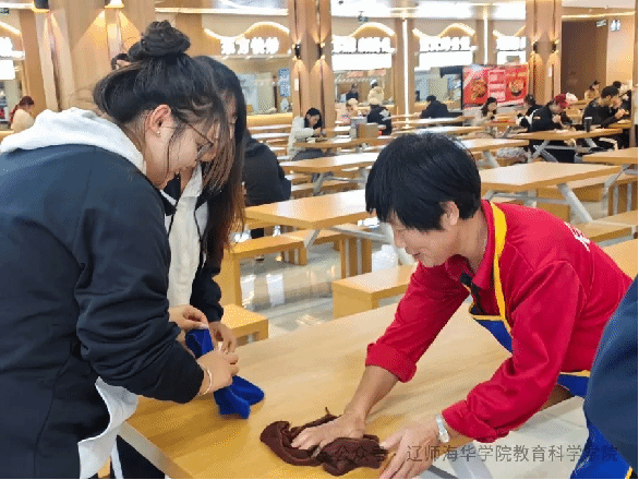 随后,同学们来到食堂,协助后勤人员开展卫生清洁工作。他们仔细擦拭桌椅,认真清扫地面,有序整理餐盘。以实际行动为后勤人员的清扫工作贡献力量,共同打造整洁美丽的校园环境。同时,他们也在此次活动中深刻领悟到节约粮食的重要意义。